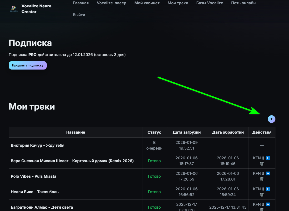 Далее во вкладке "Мои треки" можно отслеживать процесс - В очереди/Обрабатывается/Готово.